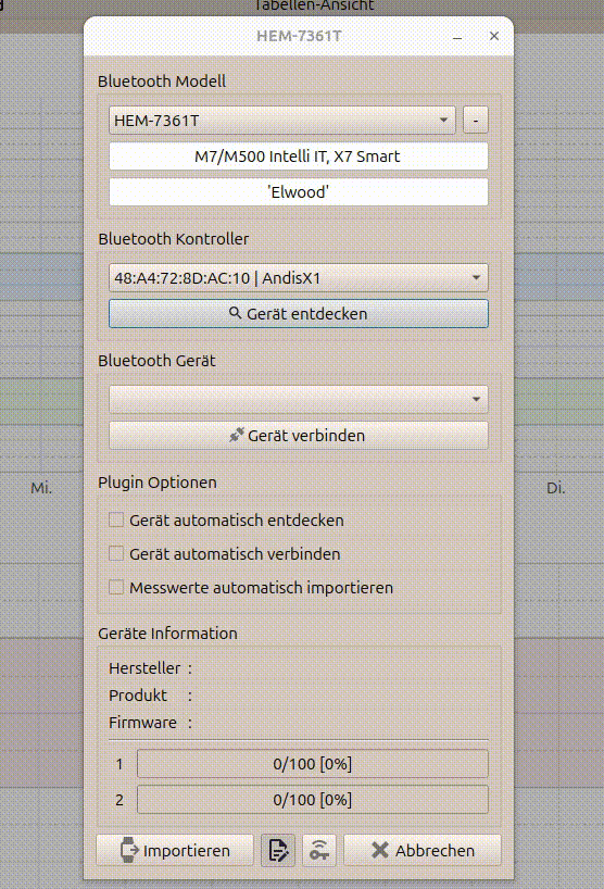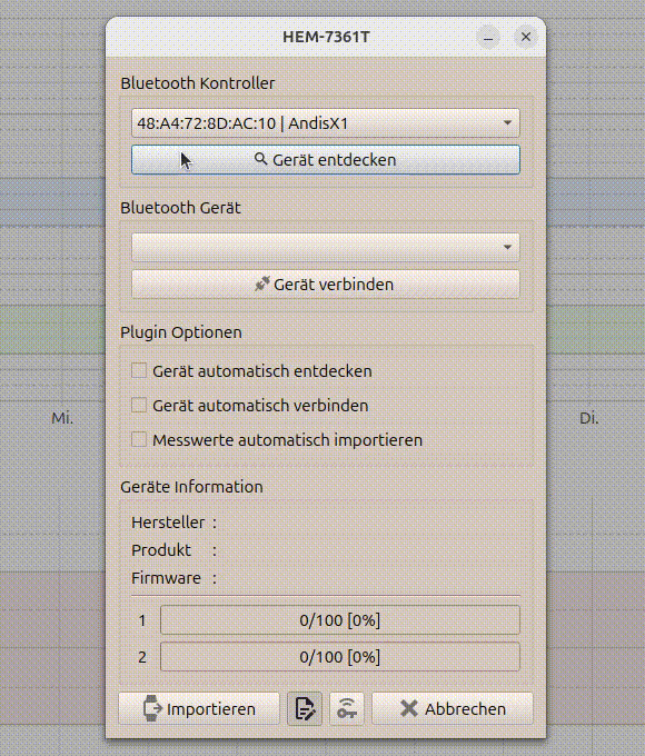 Zum Auslesen der Daten braucht man nun das Gerät nur in den Auslese-Modus versetzen (kurz Bluetooth-Taste drücken) und dann kann man über Entdecken, Verbinden, Importieren die Daten sofort in die Software importieren.