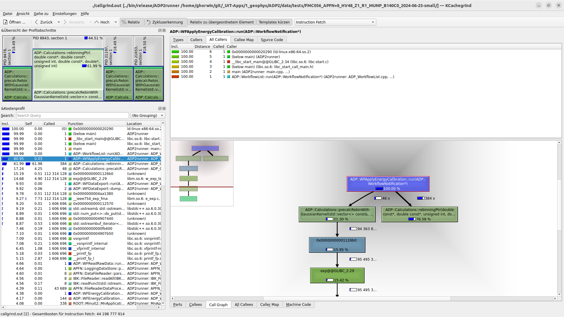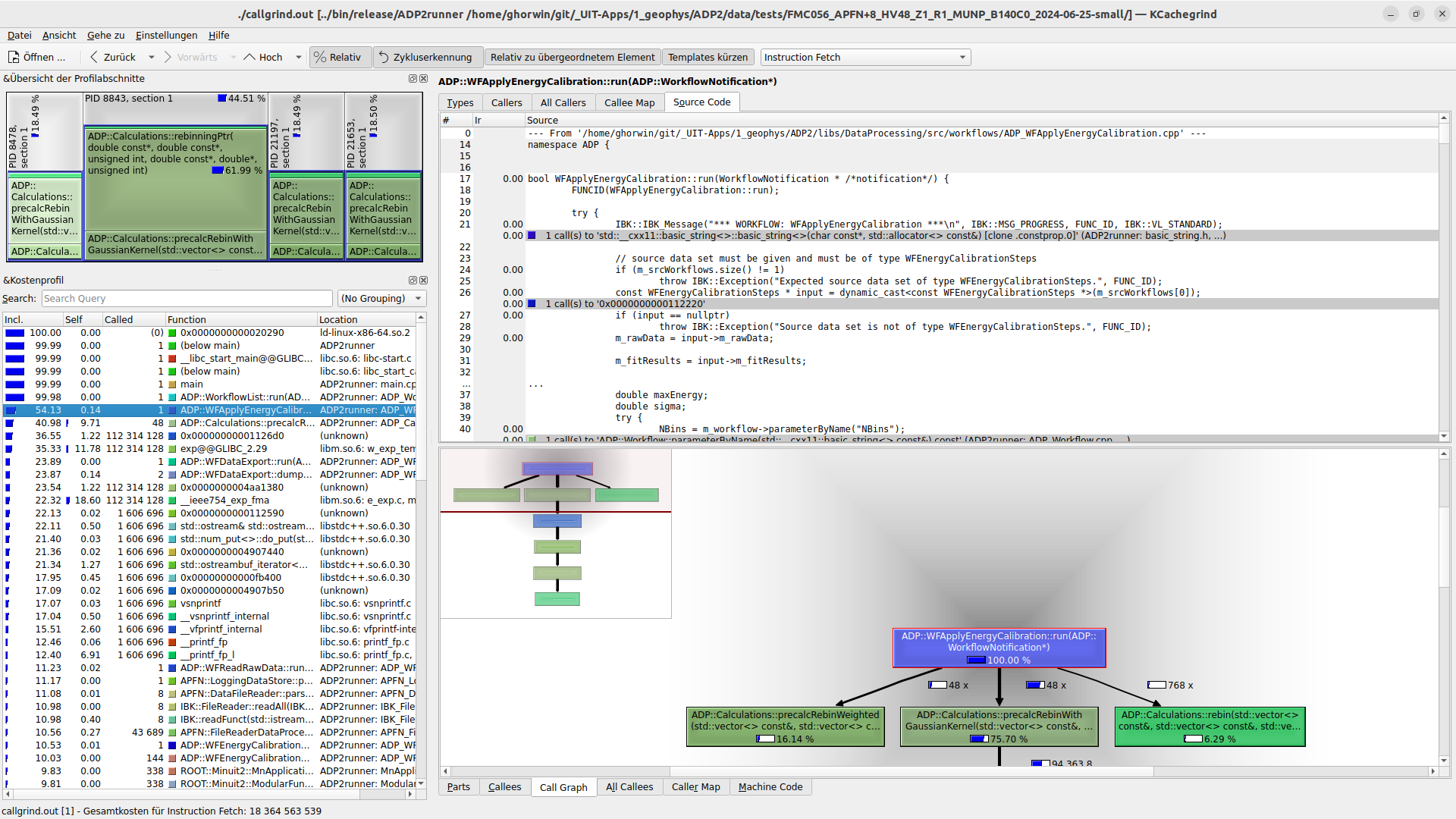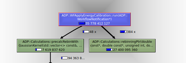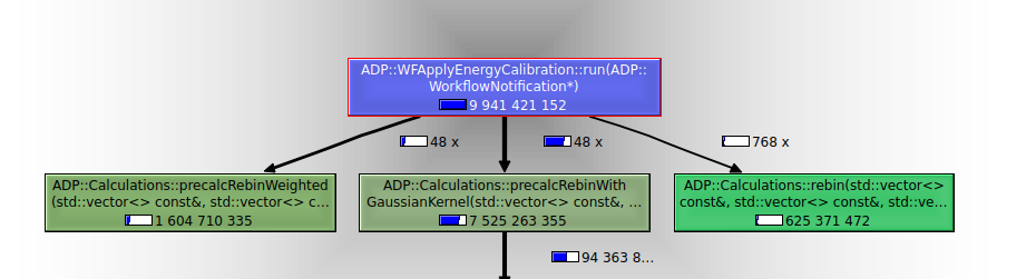 Nun kann man sich die Verteilung des Aufwands anschauen, am Besten durch Auswahl einer darüberliegenden Funktion, hier ADP::WFApplyEnergyCalibration::run