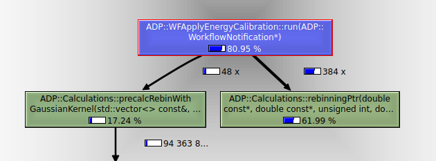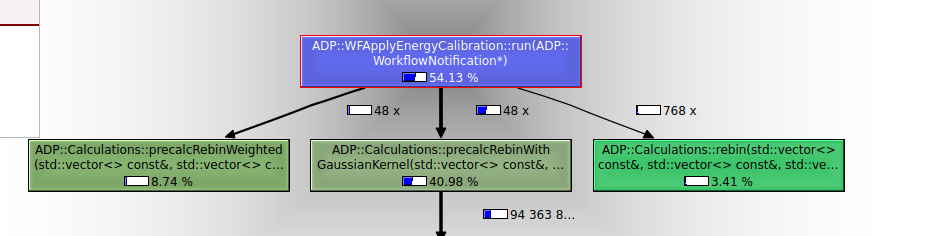 ca. 80% der gesamten Ausführungszeit. Wenn man diese wie im Screenshot oben auswählt, wird auf der rechten Seite angezeigt, welche Unterfunktionen prozentual die meiste Zeit verbrauchen. Hier ist das ADP::Calculations::rebinningPtr(...)